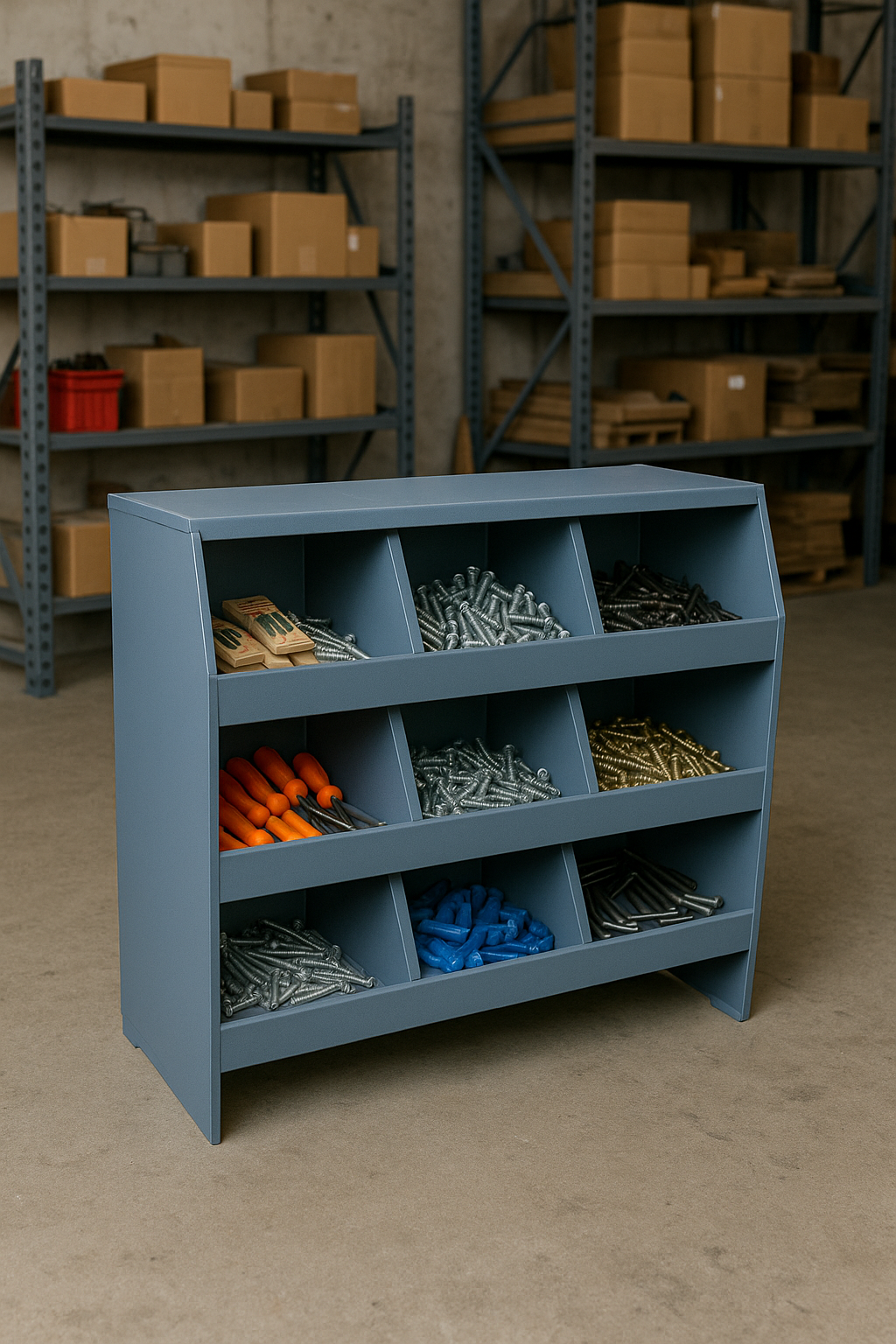 INDUSTRIAL DESIGN: Heavy-duty steel construction with 4 tiers of angled compartments for easy visibility and access to stored items