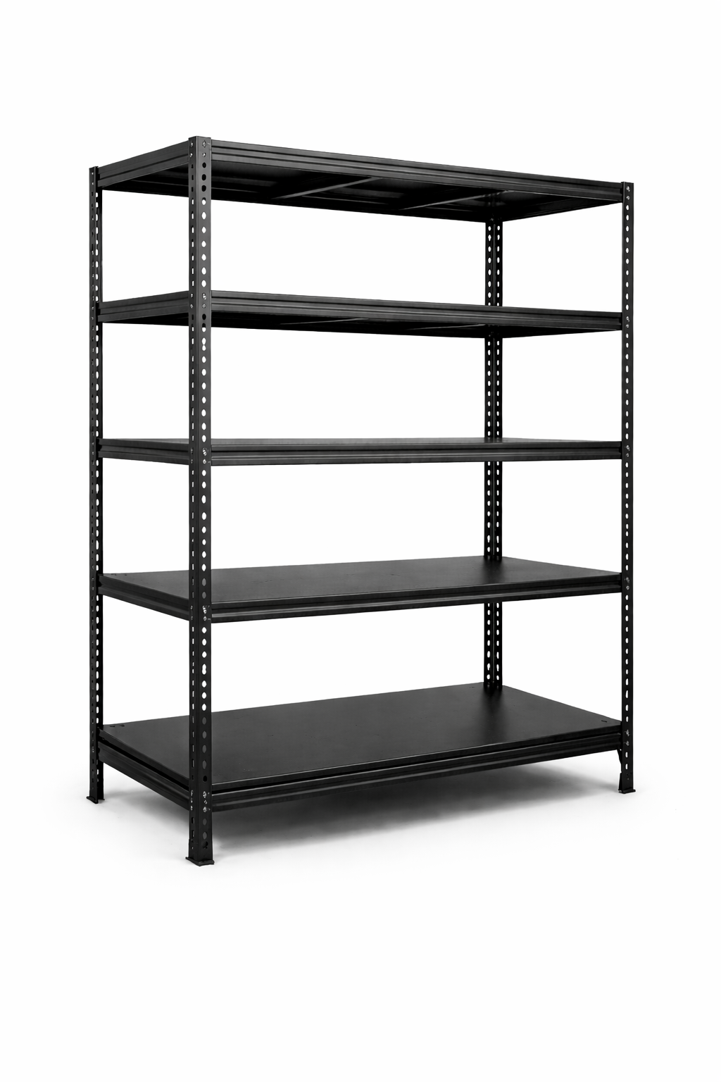Slotted Angle RacksThis heavy-duty storage rack is the ultimate solution for organising your garage, warehouse, or storage space. Standing at an impressive 251 cm tall, 147 cm wide, and 91 cm deep, this robust 5-tier shelving unit provides ample storage capacity for all your needs. The metal construction features a durable powder-coated black finish that not only looks sleek but also protects against rust and wear, ensuring long-lasting performance even in demanding environments. Each of the five spacious shelves offers generous surface area to accommodate boxes, tools, equipment, and heavy items with ease. The adjustable shelf design allows you to customise the spacing between levels to suit items of varying heights, from small containers to large storage bins. Built to withstand substantial weight loads, this shelving unit is engineered for stability and strength, making it ideal for both residential and commercial applications. The open-frame design provides easy access to stored items from all sides whilst maintaining excellent visibility. Assembly is straightforward with the included hardware, and the sturdy frame ensures your belongings remain secure and well-organised. Transform your cluttered space into an efficient storage area with this versatile and dependable shelving solution.