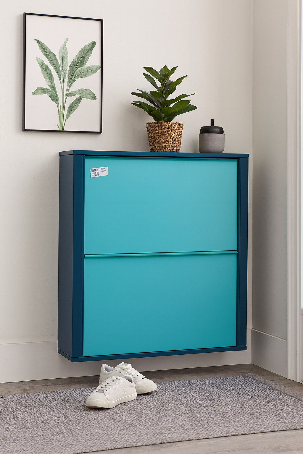 Transform your entryway organisation with this stylish 4-tier angled shoe rack in sophisticated navy blue and turquoise. The modern, space-efficient design features cleverly angled shelves that maximise visibility and accessibility of your footwear collection. Each tier provides ample space for multiple pairs of shoes, from casual trainers to formal footwear, while the angled orientation ensures easy selection and prevents shoes from falling forward. The sturdy construction offers reliable storage without compromising on style, making it perfect for contemporary homes. The compact yet functional design makes efficient use of vertical space, ideal for small entryways, wardrobes, or utility rooms. The contrasting navy blue frame and turquoise shelves add a fresh, contemporary touch to your space while keeping your shoes neatly organised and readily accessible. This practical storage solution helps maintain a clutter-free environment while adding a modern aesthetic to your home decor.